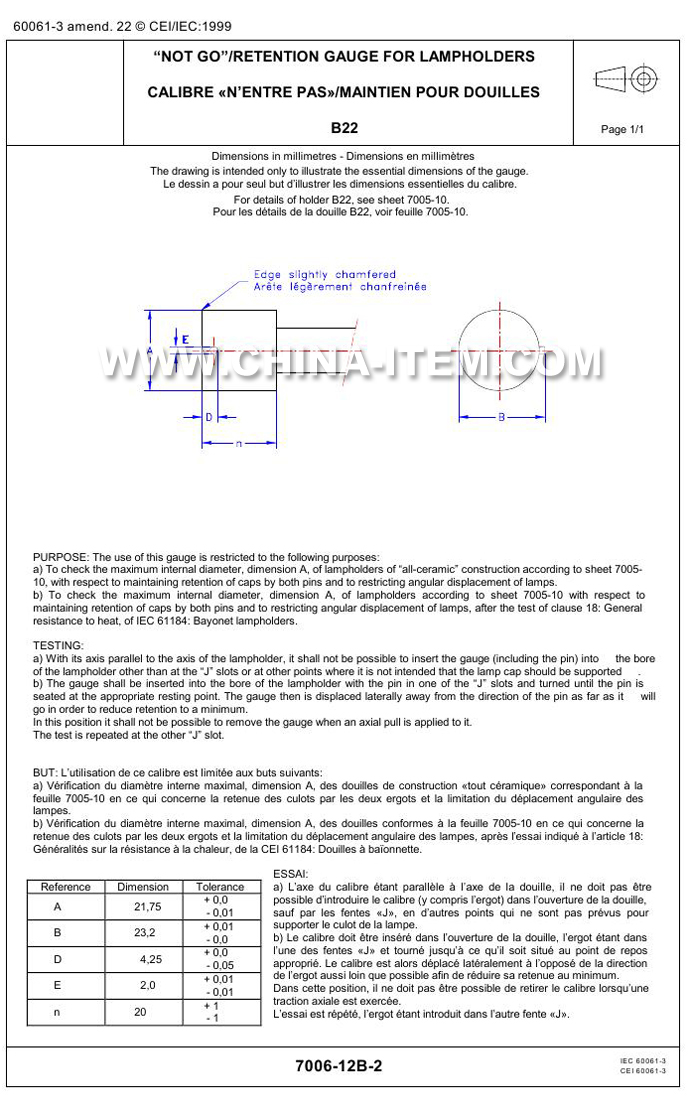 IEC60061-3: 7006-12B-2 B22 Not Go /Retention Gauge for Lampholders
